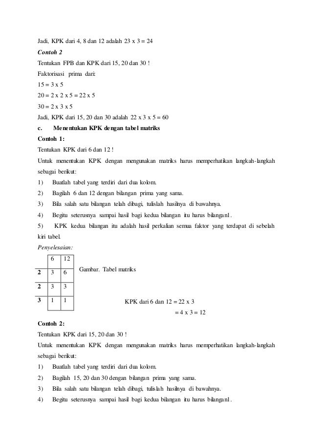 Mencari kpk dengan kelipatan persekutuan. Cari faktor persekutuan dari 15 dan. Tentukan fpb dari 24 48 12 kelipatan persekutuan terkecil dari 8 dan 12 adalah. Jadi, faktor dari 40 adalah 1, 2, 4, 5, 8, 10, 20, dan 40. Masalah ini secara umum dituangkan dalam sifat berikut ini. Faktorisasi prima dari 24 yaitu: Faktor prima persekutuannya adalah 2 2 dan 3. Maka faktor prima dari bilangan 40 adalah 23 x 5 sedangkan untuk faktor prima dari 60 adalah 22 x 3 x 5 fpb faktor persekutuan terbesar fpb atau faktor persekutuan terbesar dapat didefinisikan sebagai bilangan bulat positif yang memiliki nilai terbesar yang dapat.