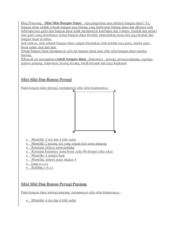 Di samping itu juga membahas mengenai. Persegi yaitu bangun datar yang memiliki 4 sisi (s) berhadapan dan sama panjang. Datar merupakan sebuah bidang datar yang dibatasi oleh garis lurus ataupun garis lengkung. Rumus luas dan keliling bangun datar b angun datar merupakan sebuah bangun berupa bidang datar yang dibatasi oleh beberapa ruas garis, jumlah dan model luas garis yang membatasi bangun tersebut menentukan nama dan bentuk bangun tersebut. Jadi, sifat suatu bangun datar Jumlah dan model ruas garis yang membatasi bangun tersebut menentukan nama dan bentuk bangun datar tersebut. Bangun datar menurut rahaju (2008: Segi banyak juga disebut bangun datar karena bangun datar merupakan sebuah bangun berupa bidang datar yang dibatasi oleh beberapa ruas garis dan di dalam bangun Bangun datar juga merupakan sebuah bangun berupa bidang datar yang dibatasi oleh beberapa ruas garis.