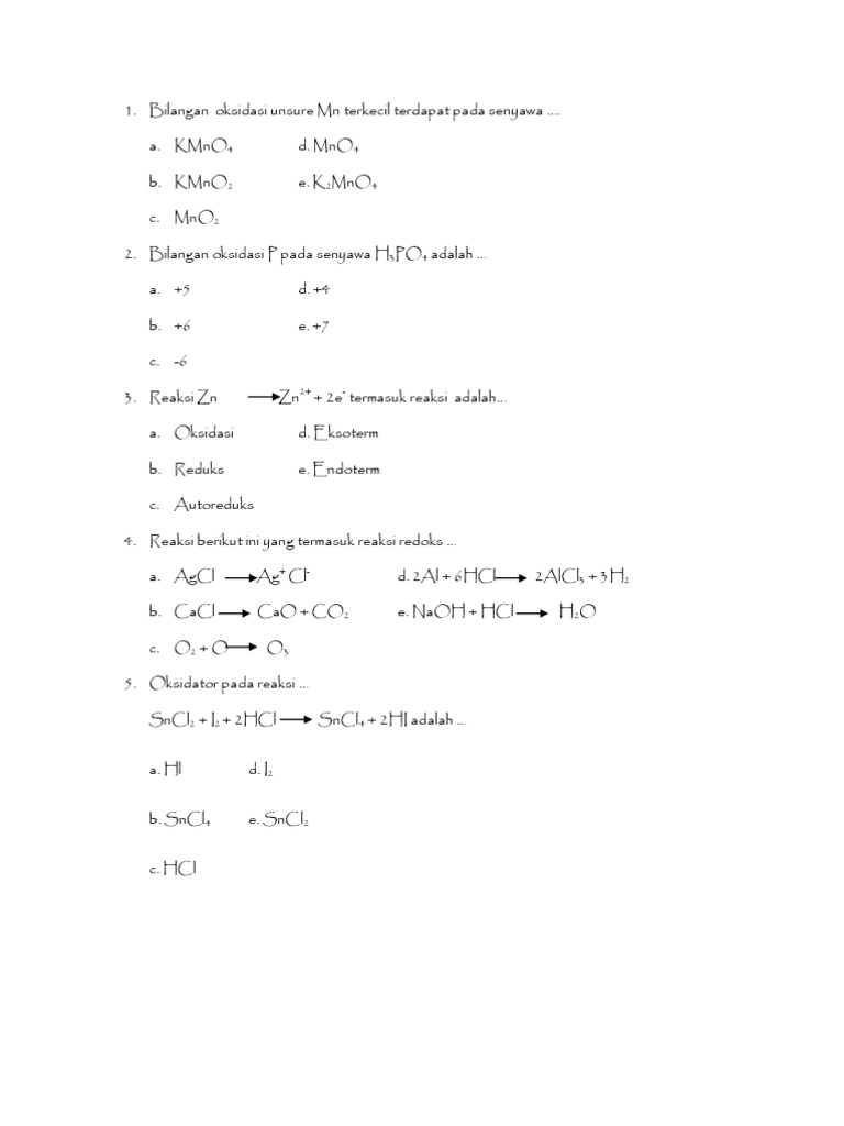 4 pei dan 2 peb d. 6 pei dan 5 peb b. Kmno4 larut dalam air membentuk larutan berwarna ungu tua. Unsur mn yang mempunyai bilangan oksidasi sama dengan bilangan oksidasi cr dalam k 2 cr 2 o 7 terdapat dalam senyawa. Kali ini gurune akan membahas latihan soal serta jawabannya bab reaksi redoks. Bilangan oksidasi mn tertinggi pada senyawa? Bilangan oksidasi mn tertinggi dapat diketahui dengan menghitung bilangan oksidasi mn pada tiap pilihan jawaban, yaitu: 3 pei dan 3 peb e. Enam kelompok elektron tersebut terdiri dari.